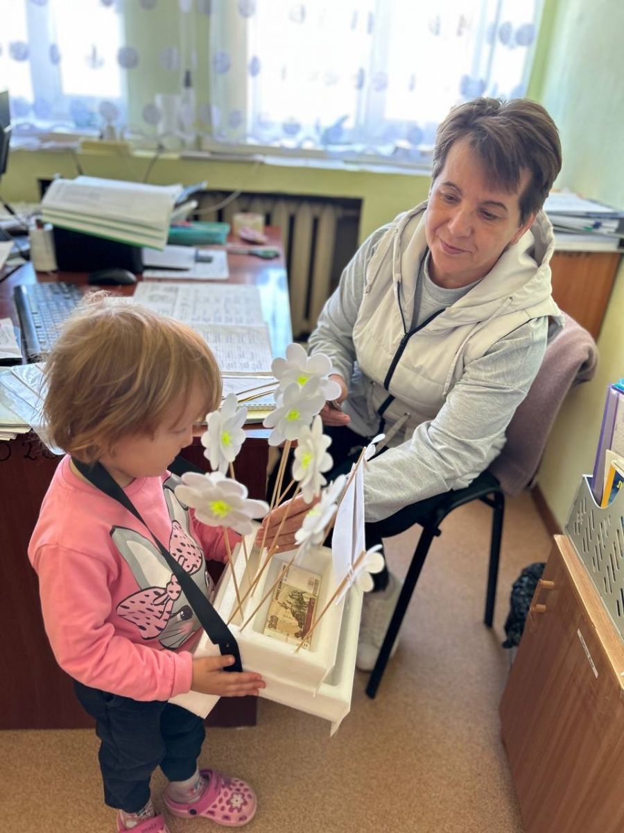 Ребята с любовью и нежностью изготовили поздравительные открытки, которые с удовольствием подарили работникам центра.